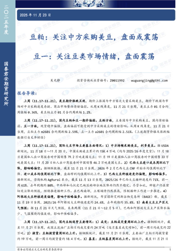 【国泰君安期货】【202511】豆粕:关注中方采购美豆,盘面或震荡;豆一:关注豆类市场情绪,盘面震荡-6页 证券期货研究报告