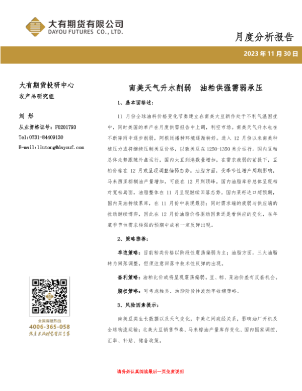 【大有期货】【20231130】油脂油料期货12月月度分析报告:南美天气升水削弱 油粕供强需弱承压-16页 行业研究