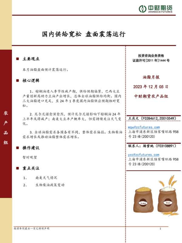 【中财期货】【20231205】油脂月报:国内供给宽松 盘面震荡运行-10页 行业研究