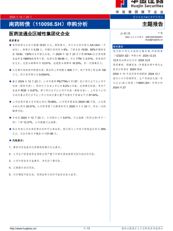 【华金证券】【20241225】南药转债(110098.SH)申购分析:医药流通业区域性集团化企业-13页 行业研究