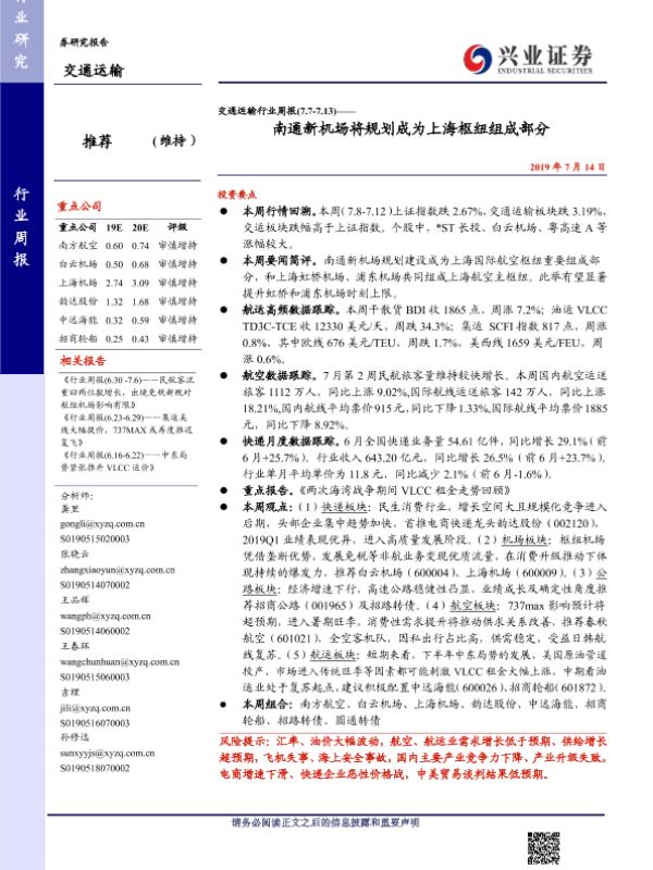 【兴业证券】【20190714】交通运输行业周报:南通新机场将规划成为上海枢纽组成部分-16页 行业研究
