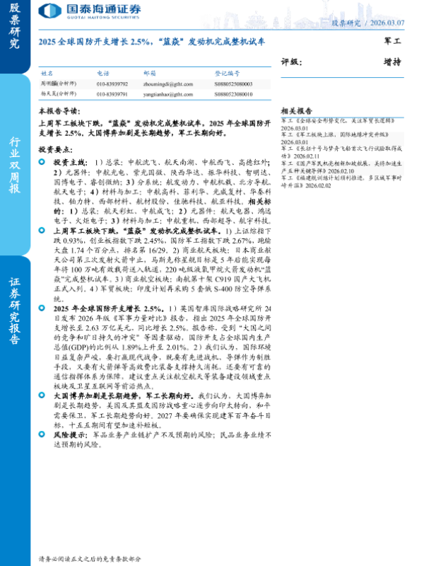 【国泰海通证券】【202603】军工行业双周报:2025全球国防开支增长2.5%,“蓝焱”发动机完成整机试车-12页 证券期货研究报告