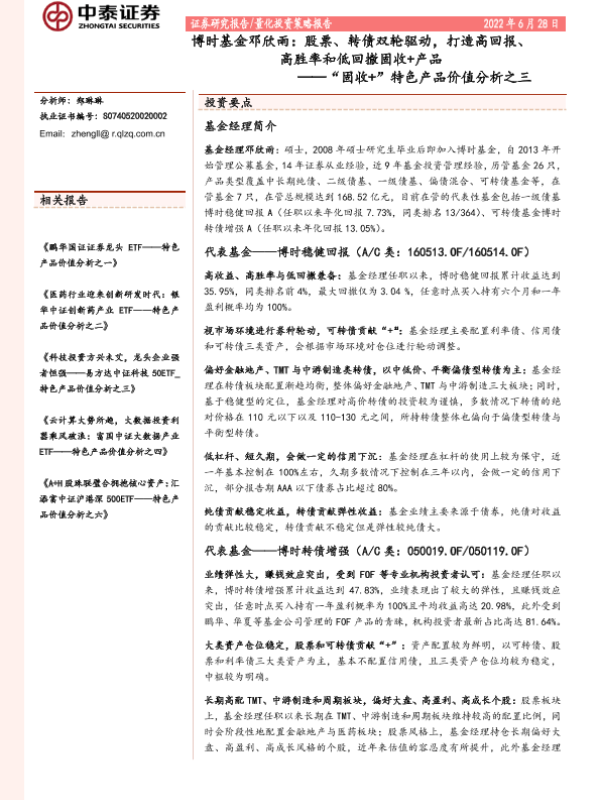 【中泰证券】【20220628】“固收+”特色产品价值分析之三:博时基金邓欣雨,股票、转债双轮驱动,打造高回报、高胜率和低回撤固收+产品-24页 行业研究