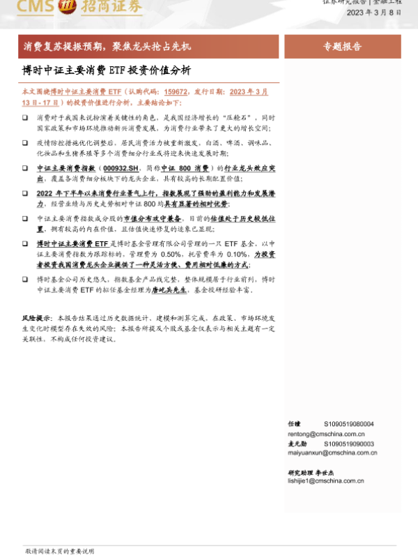 【海通证券】【20230308】博时中证主要消费ETF投资价值分析:消费复苏提振预期,聚焦龙头抢占先机-15页 行业研究
