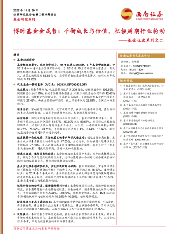 【西南证券】【20221130】基金优选系列之二:博时基金金晟哲,平衡成长与估值,把握周期行业轮动-19页 行业研究
