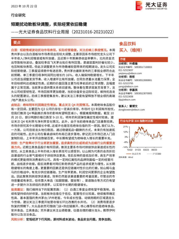【光大证券】【20231022】20231022-光大证券-食品饮料行业周报:短期扰动致板块调整,实际经营依旧稳健-10页 行业研究