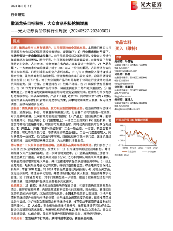【光大证券】【20240603】食品饮料行业周报:徽酒龙头目标积极,大众食品积极挖掘增量-10页 行业研究