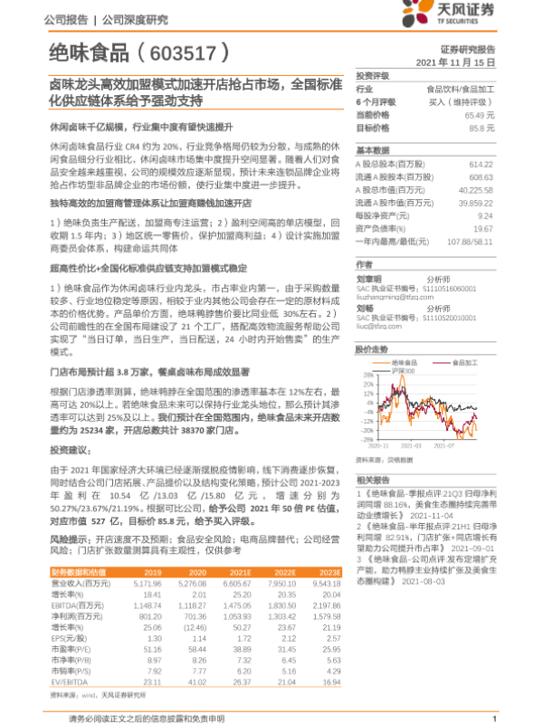 【天风证券】【20211115】绝味食品-603517.SH-卤味龙头高效加盟模式加速开店抢占市场,全国标准化供应链体系给予强劲支持-30页 行业研究