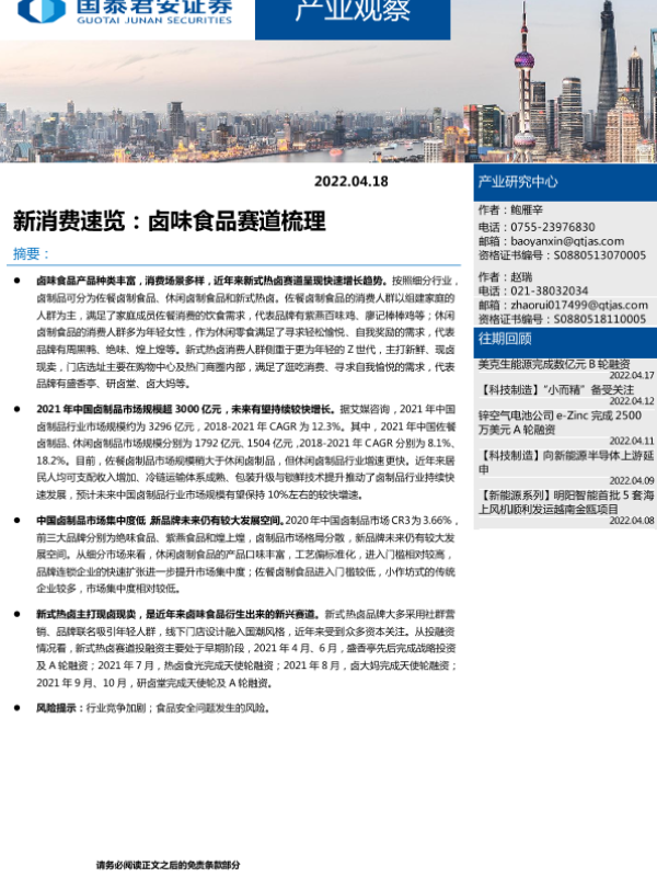 【国泰君安证券】【20220418】新消费速览:卤味食品赛道梳理-7页 行业研究
