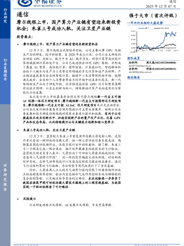 【华福证券】【202312】通信行业定期报告_摩尔线程上市_国产算力产业链有望迎来新投资机会;朱雀三号成功入轨_关注卫星产业链-2页 证券期货研究报告