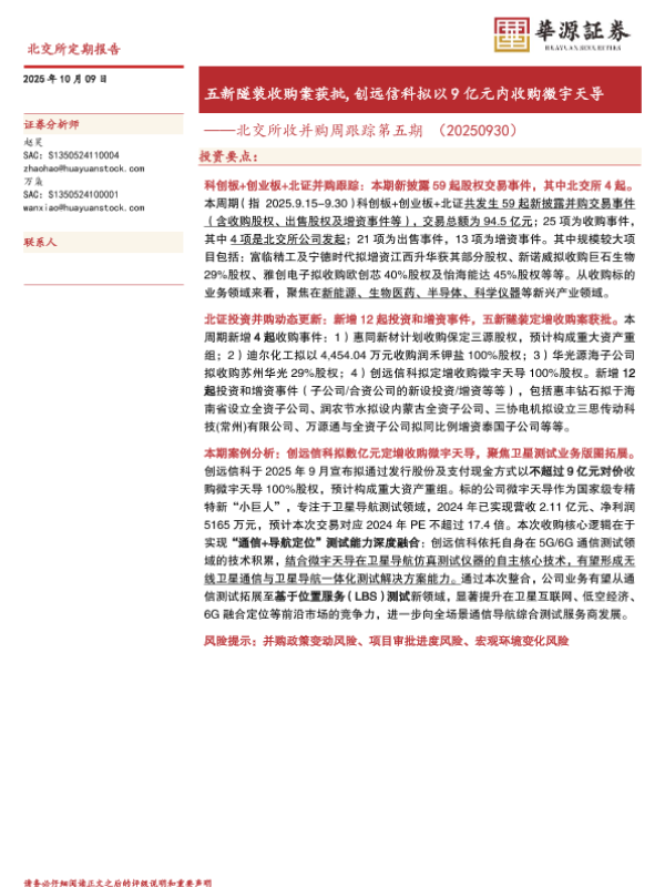 【开源证券】【202509】北交所策略并购专题报告第七期:创远信科发行股份购买微宇天导100%股权,控股股东注入卫星导航核心资产-14页 证券期货研究报告