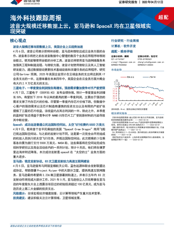 【国信证券】【20220412】海外科技跟踪周报:波音大规模迁移数据上云,亚马逊和SpaceX均在卫星领域实现突破-7页 行业研究