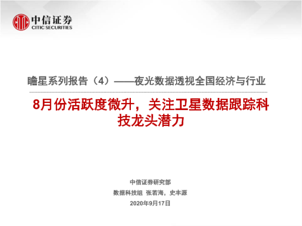 【中信证券】【20200917】瞻星系列报告(4):夜光数据透视全国经济与行业:8月份活跃度微升,关注卫星数据跟踪科技龙头潜力-23页 行业研究