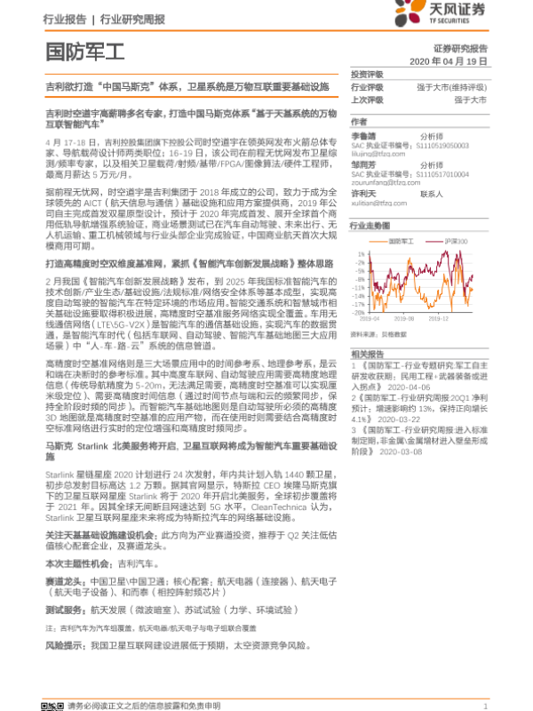 【天风证券】【20200419】国防军工行业研究周报:吉利欲打造“中国马斯克”体系,卫星系统是万物互联重要基础设施-3页 行业研究