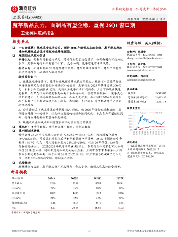 【浙商证券】【2025】魔芋新品发力,面制品有望企稳,重视 26Q1窗口期——卫龙美味更新报告-3页 证券期货研究报告