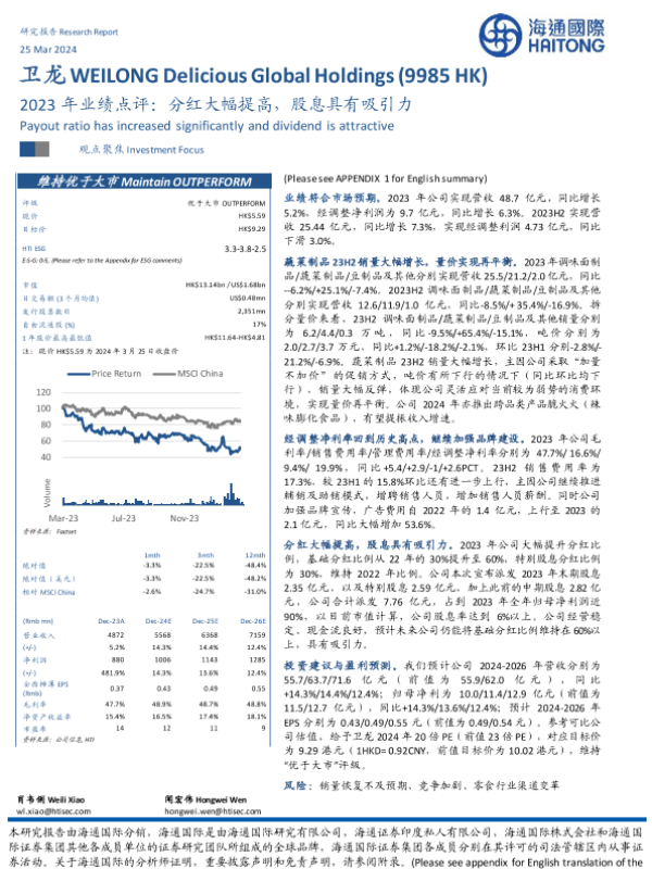【海通国际】【20240325】卫龙美味(9985.HK)2023年业绩点评:分红大幅提高,股息具有吸引力-13页 行业研究