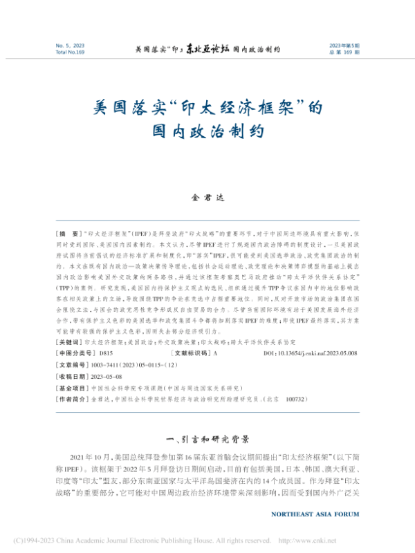 【金君达】【20230508】美国落实“印太经济框架”的国内政治制约-13页 行业研究