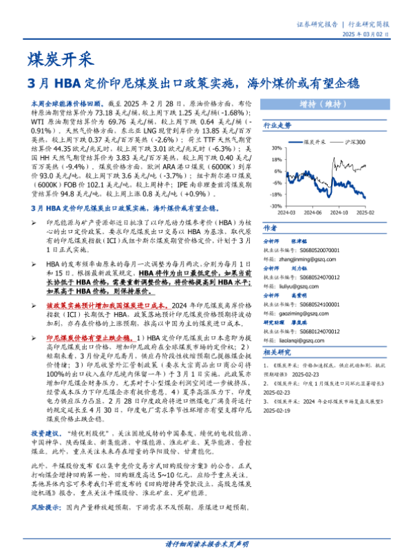 【国盛证券】【20250315】2025年03月15日更新-【国盛证券】煤炭开采行业研究简报:3月HBA定价印尼煤炭出口政策实施,海外煤价或有望企稳-13页 行业研究