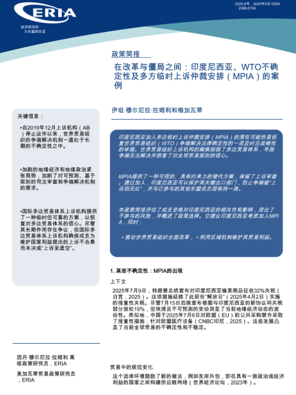 【ERIA】【202509】在改革与瘫痪之间:印度尼西亚、世贸组织的不确定性和多党临时上诉仲裁安排案-8页 政策文件