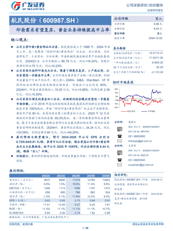 【广发证券】【20241222】航民股份(600987.SH):印染需求有望复苏,黄金业务持续提高市占率-28页 行业研究