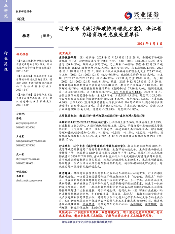 【兴业证券】【20240101】环保行业周报:辽宁发布《减污降碳协同增效方案》,浙江着力培育领先危废处置单位-12页 行业研究