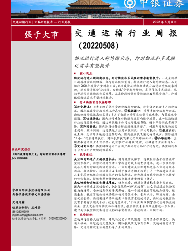 【中银证券】【20220508】交通运输行业周报:物流运行进入新均衡状态,即时物流和多式联运需求有望提升-26页 行业研究