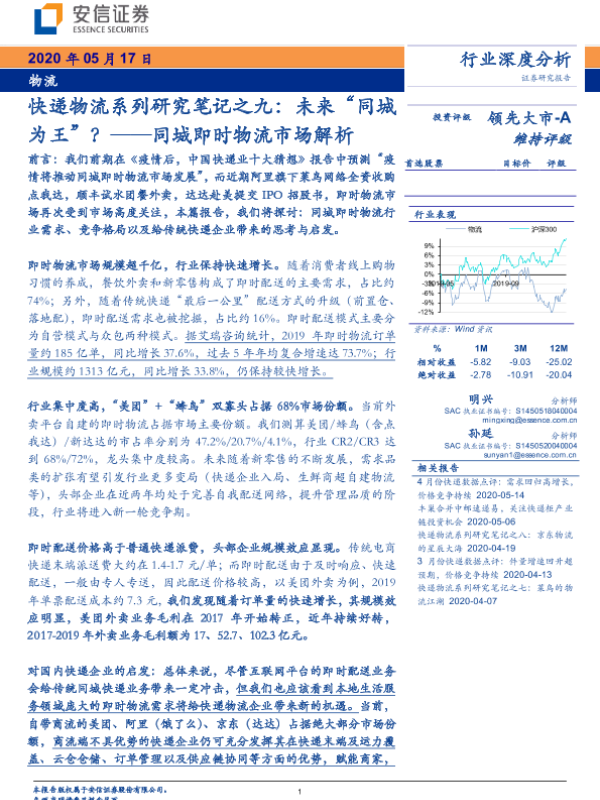【安信证券】【20200517】物流行业深度分析:同城即时物流市场解析-21页 行业研究