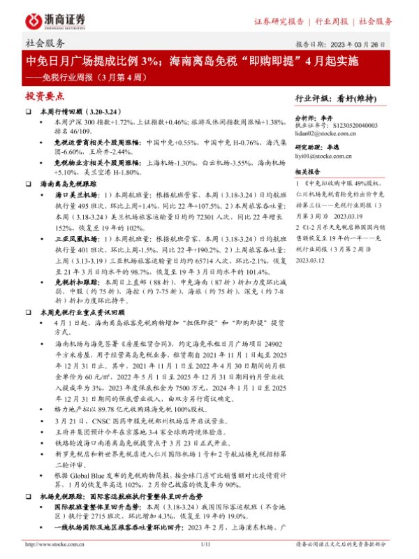 【浙商证券】【20230326】免税行业周报:中免日月广场提成比例3%;海南离岛免税“即购即提”4月起实施-11页 行业研究