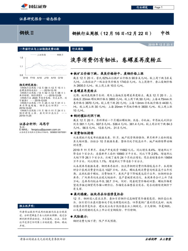 【国信证券】【20191223】20191223-国信证券-钢铁行业周报:淡季消费仍有韧性,卷螺差再度转正-15页 行业研究
