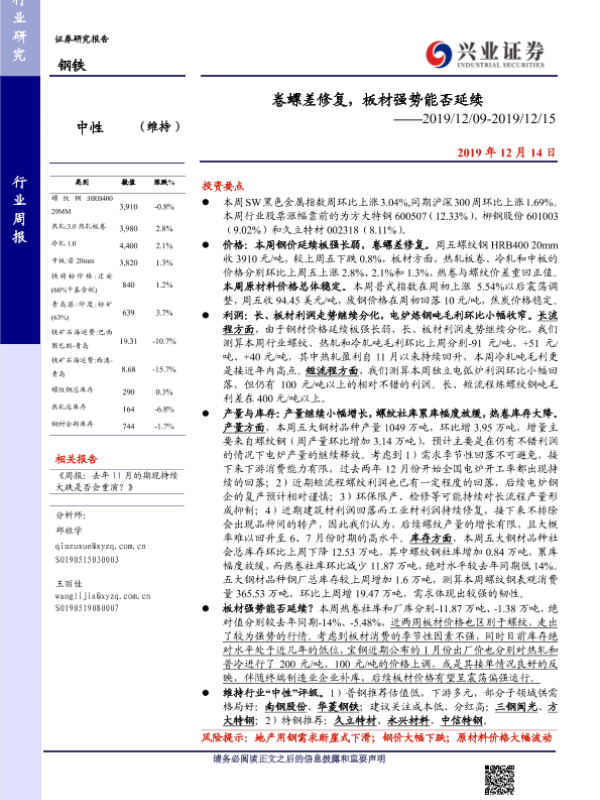 【兴业证券】【20191214】20191214-兴业证券-钢铁行业周报:卷螺差修复,板材强势能否延续-17页 行业研究