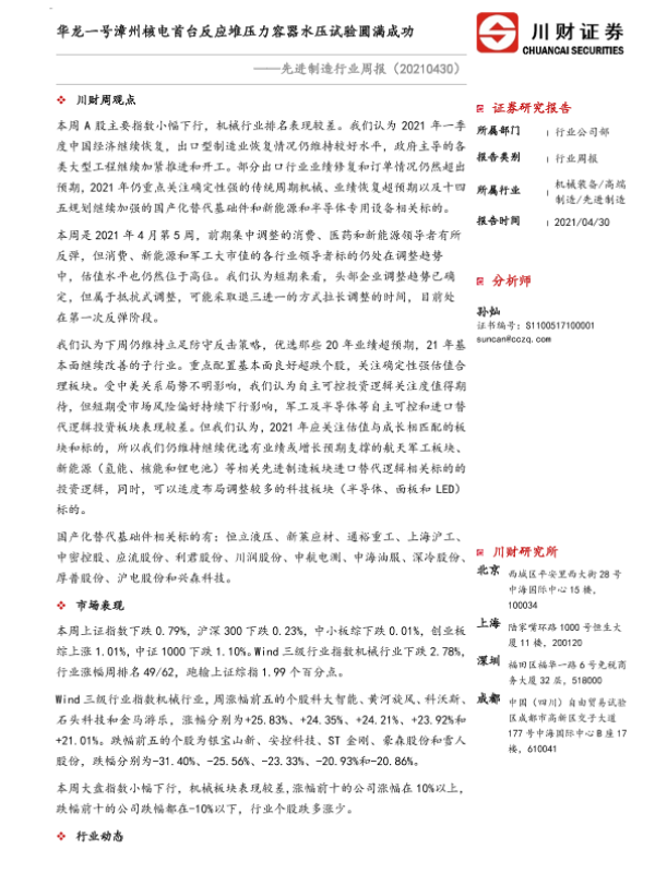 【川财证券】【20210430】20210430-川财证券-先进制造行业周报:华龙一号漳州核电首台反应堆压力容器水压试验圆满成功-14页 行业研究