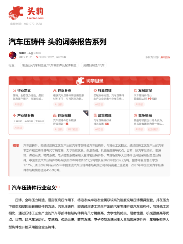 【头豹研究院】【20231130】汽车压铸件 头豹词条报告系列-17页 行业研究
