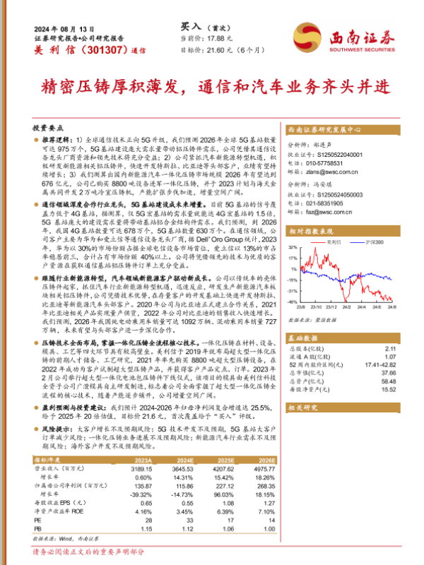 【西南证券】【20240813】精密压铸厚积薄发,通信和汽车业务齐头并进-38页 行业研究