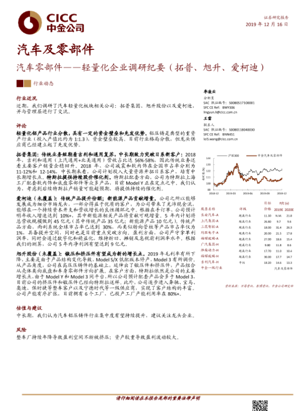 【中金公司】【20191216】汽车及零部件行业动态:轻量化企业调研纪要(拓普、旭升、爱柯迪)-5页 行业研究
