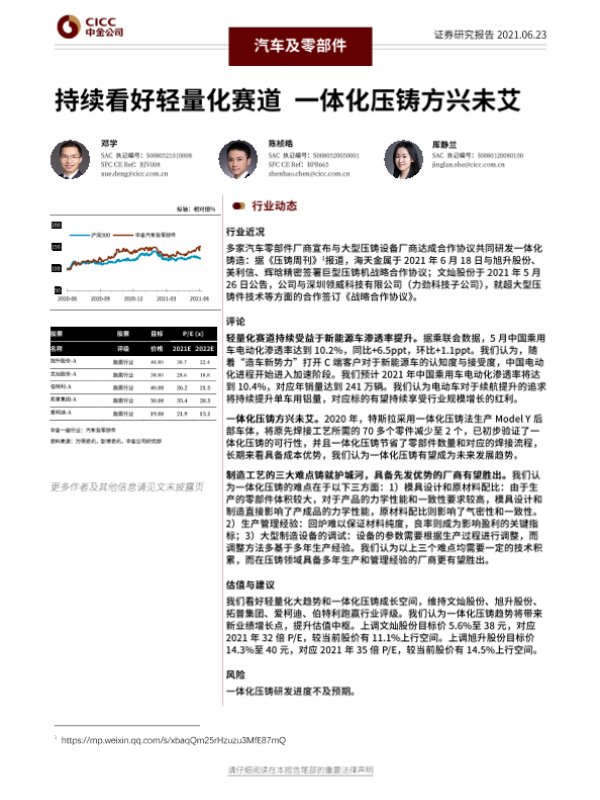 【中金公司】【20210623】汽车及零部件行业动态:持续看好轻量化赛道 一体化压铸方兴未艾-5页 行业研究