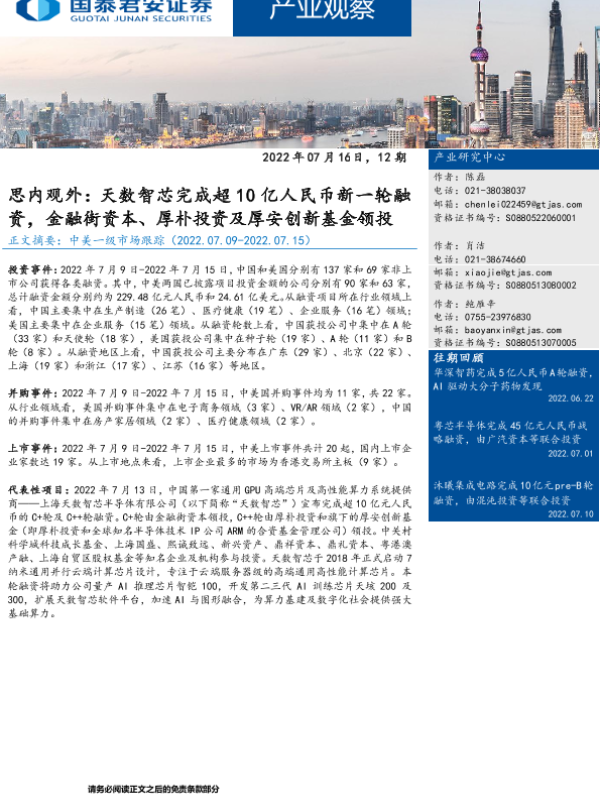 【国泰君安证券】【20220716】产业观察12期:思内观外,天数智芯完成超10亿人民币新一轮融资,金融街资本、厚朴投资及厚安创新基金领投-27页 行业研究