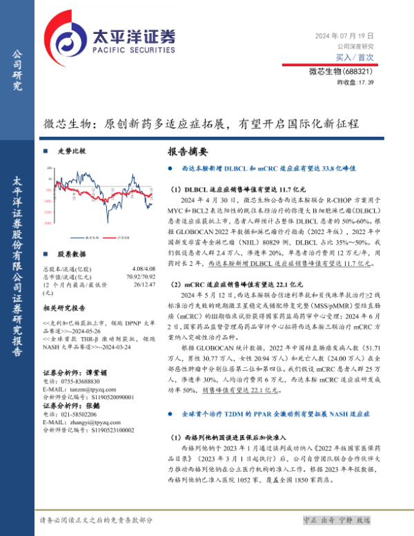 【太平洋证券】【20240719】微芯生物:原创新药多适应症拓展,有望开启国际化新征程-38页 行业研究