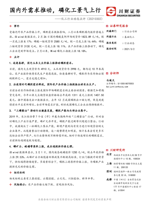 【川财证券】【20210302】化工行业动态点评:国内外需求推动,磷化工景气上行-2页 证券期货研究报告