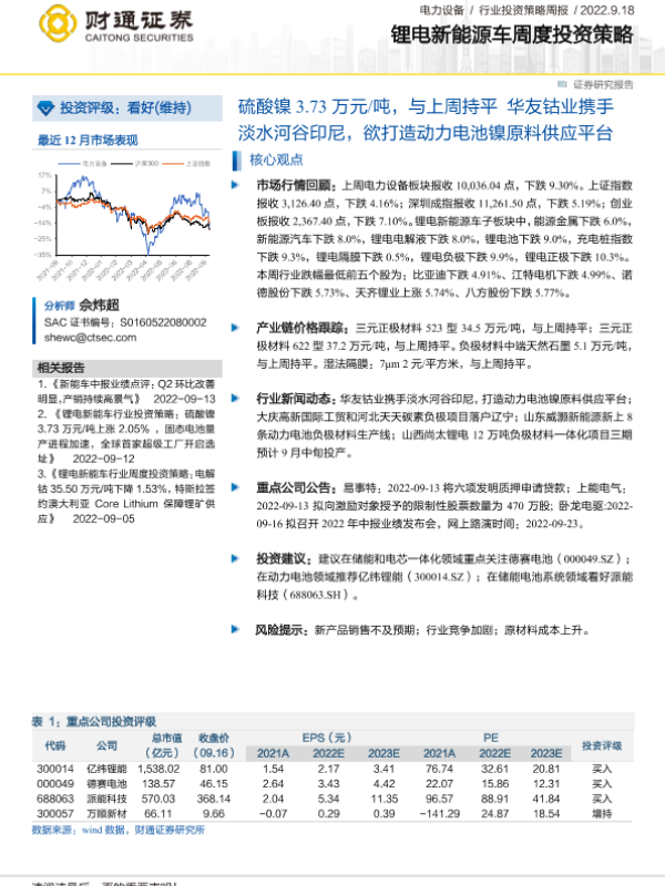 【财通证券】【20220918】20220918-财通证券-锂电新能源车周度投资策略:硫酸镍3.73万元/吨,与上周持平华友钴业携手淡水河谷印尼,欲打造动力电池镍原料供应平台-17页 行业研究