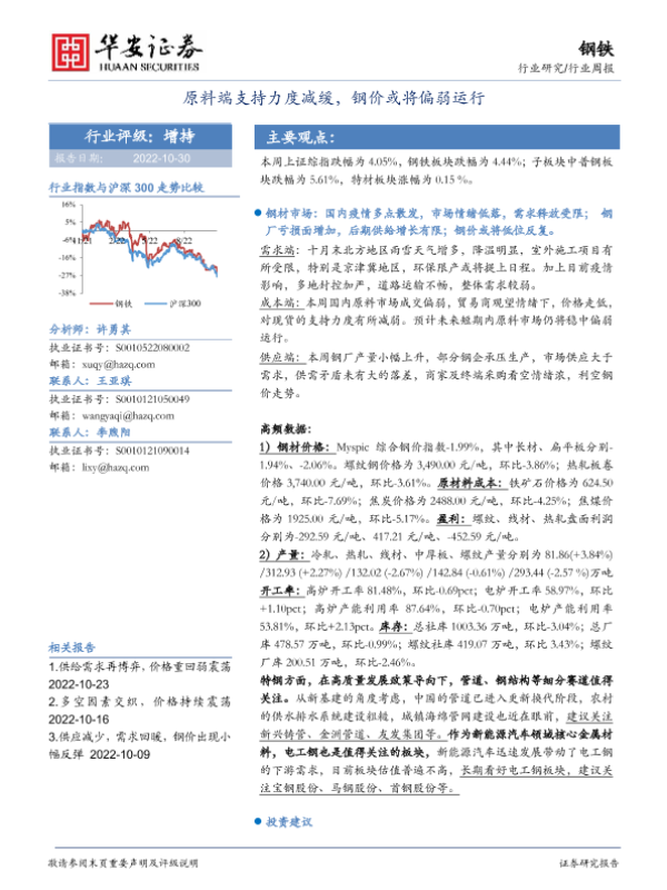 【华安证券】【20221030】20221030-华安证券-钢铁行业周报:原料端支持力度减缓,钢价或将偏弱运行-14页 行业研究