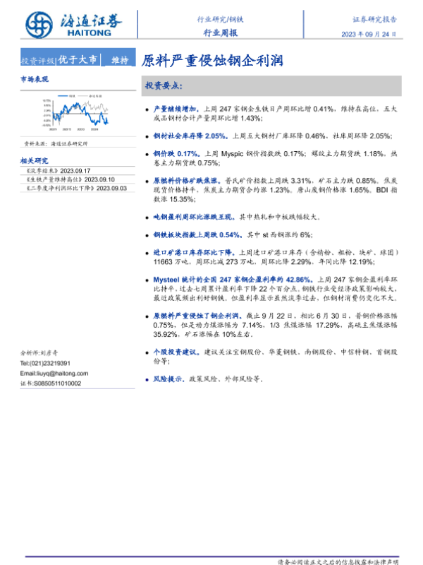 【海通证券】【20230924】20230924-海通证券-钢铁行业周报:原料严重侵蚀钢企利润-15页 行业研究