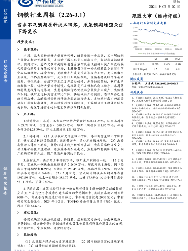【华福证券】【20240302】20240302-华福证券-钢铁行业周报:需求不及预期原料成本回落,政策预期增强关注下游复苏-17页 行业研究