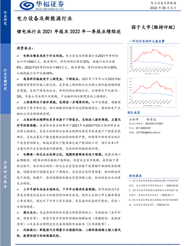 【华福证券】【20220503】锂电池行业2021年报及2022年一季报业绩综述-10页 行业研究