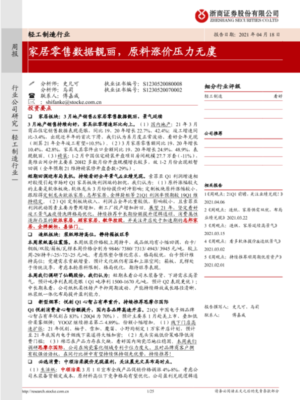 【浙商证券】【20210418】20210418-浙商证券-轻工制造行业周报:家居零售数据靓丽,原料涨价压力无虞-25页 行业研究