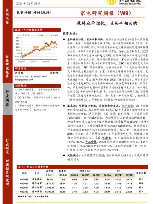 【财通证券】【20210308】20210308-财通证券-家电研究周报(W9):原料涨价担忧,巨头争相回购-20页 行业研究