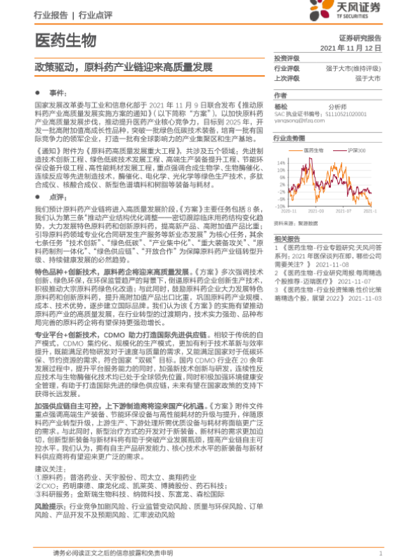 【天风证券】【20211112】医药生物行业点评:政策驱动,原料药产业链迎来高质量发展-2页 行业研究