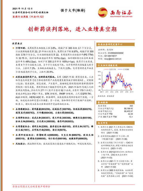 【西南证券】【20211113】医药行业周报:创新药谈判落地,进入业绩真空期-37页 行业研究