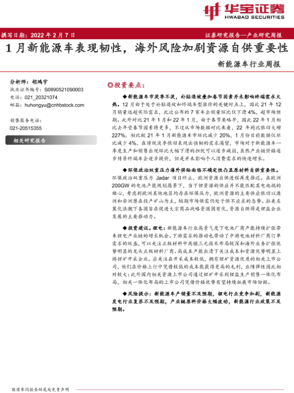 【华宝证券】【20220207】20220207-华宝证券-新能源车行业周报:1月新能源车表现韧性,海外风险加剧资源自供重要性-9页 行业研究