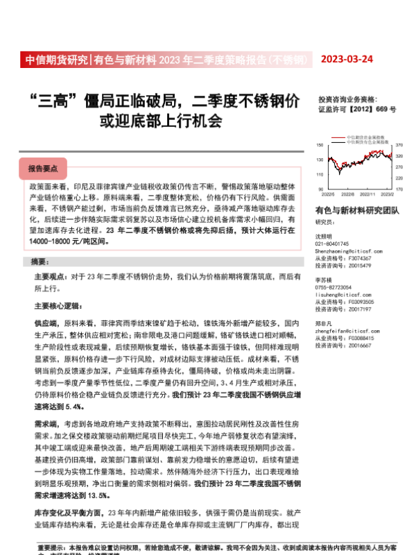 【中信期货】【20230324】有色与新材料2023年二季度策略报告(不锈钢):“三高”僵局正临破局,二季度不锈钢价或迎底部上行机会-20页 行业研究