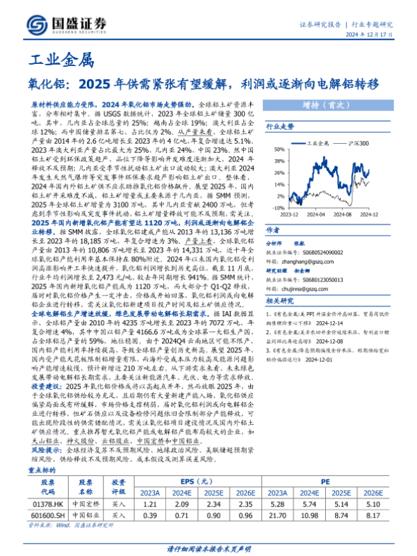 【国盛证券】【20241217】工业金属行业专题研究:氧化铝:2025年供需紧张有望缓解,利润或逐渐向电解铝转移-52页 行业研究